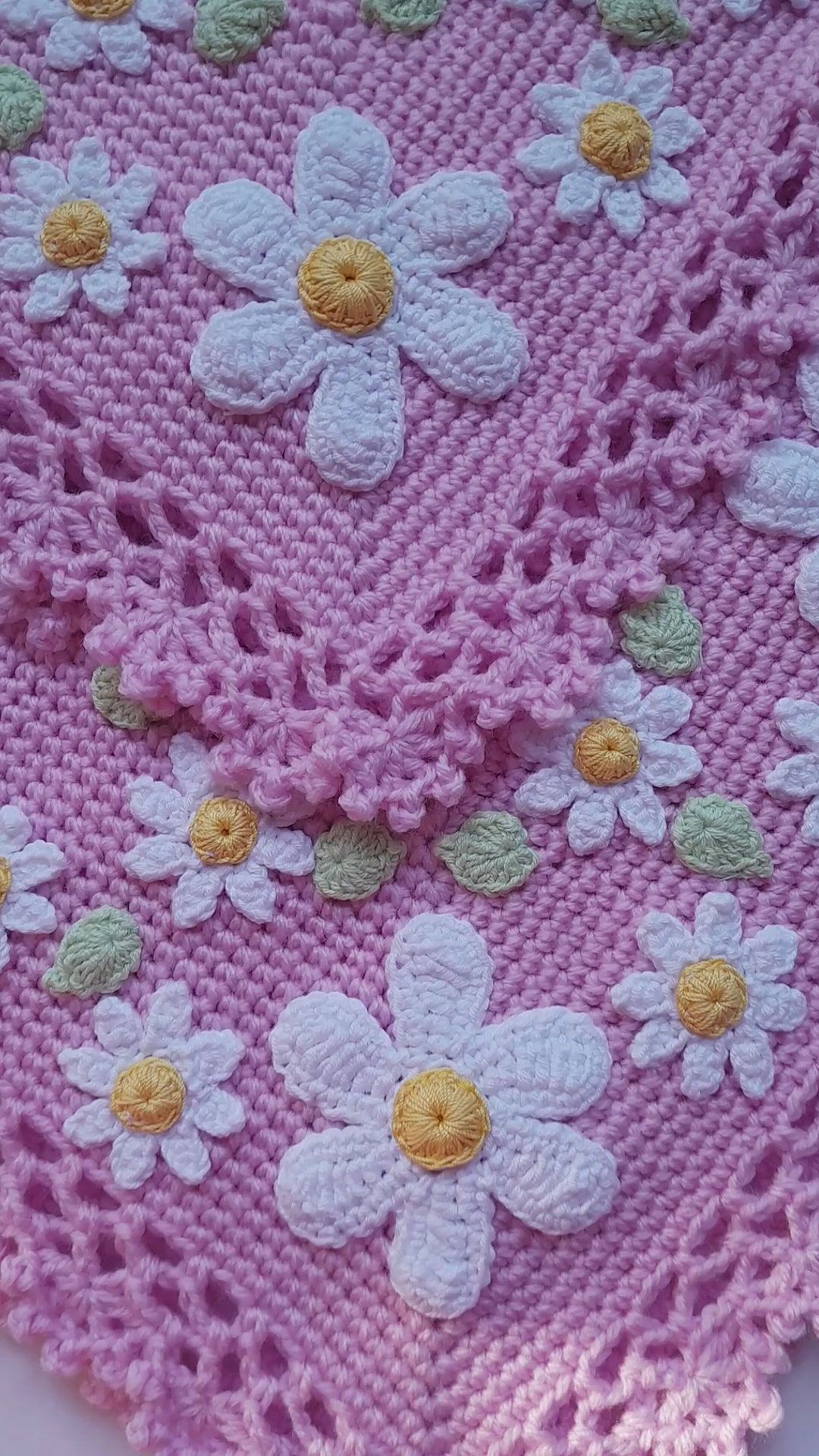 Pink Crochet Baby Blanket with Daisy Flowers Applique
